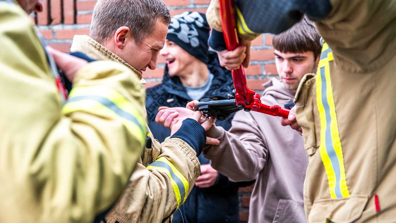 Met behulp van een betonschaar heeft de brandweer de handboeien doorgeknipt en de jongen bevrijd.