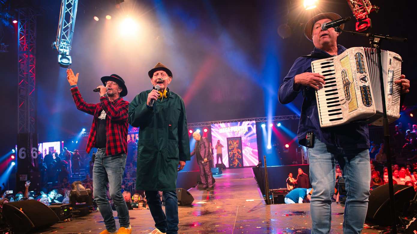 De drie mannen, Henk, Jans Hoogeveen en Cor Maatje, worden na hun medley met hun grote hits als ‘Boer Harms’, ‘Eppo’, ‘Stappen in Olde Pekela’, ‘Heb jij mien zwien ook zien’, America en Olde Pekela’ en ‘Ik zal nooit meer dronken wezen’, weer het podium opgeroepen. Want 52 jaar gaan ze al mee. Het applaus is enorm. Het hele publiek wil de mannen steunen.