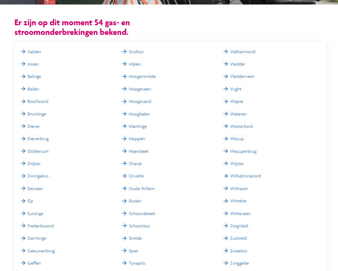 Maar op social media is te lezen dat er op meer plekken in Drenthe geen stroom meer is. Zo zijn er delen van Spier, Hooghalen, Beilen, Wateren, Smilde, Schoonoord, Diever, Dwingeloo, Zwiggelte, Elp en Schoonloo die zonder stroom zitten. Het zou gaan om in totaal 1420 postcodes.